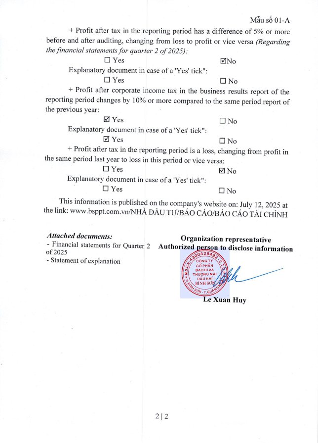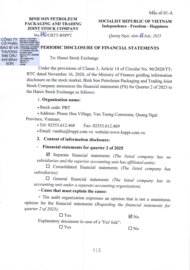 Financial report Quarter II 2025, Binh Son Petroleum Packaging and Trading Joint Stock Company