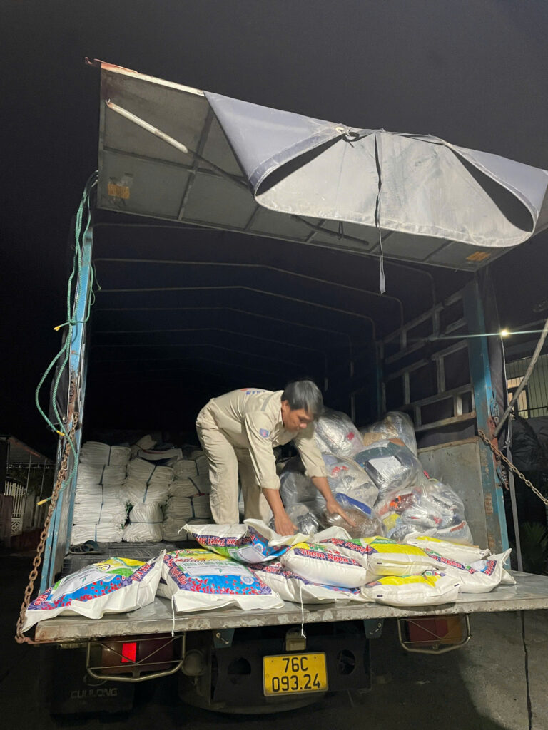 Các phần quà gồm nhu yếu phẩm như gạo, dầu ăn, mắm muối và quần áo (đã giặt sạch, phân loại) được xếp lên xe chuẩn bị cho hành trình hướng về miền Trung, Tây Nguyên